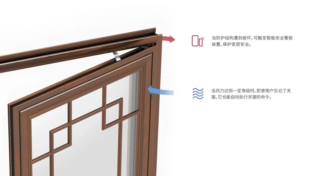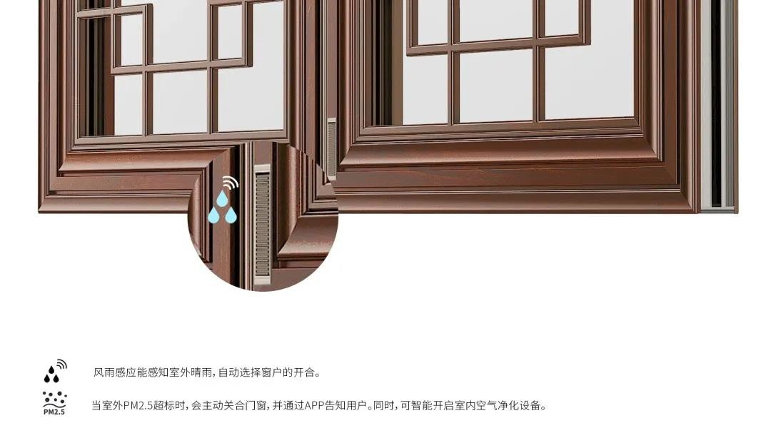 不溫不燥的外觀氣質,符合中國人對內斂和樸素的追求,但并不代表簡單。剖開層層結構,金鵬陽光中式鋁合金門窗采用木紋轉印技術,體現(xiàn)出天然的紋理和細的質感?,F(xiàn)代化風雨感應系統(tǒng),能智能感知室外晴雨,選擇窗戶的開合;當室外PM2.5超標時,會主動關合門窗,并通過APP告知用戶,同時開啟室內空氣浄化設備。