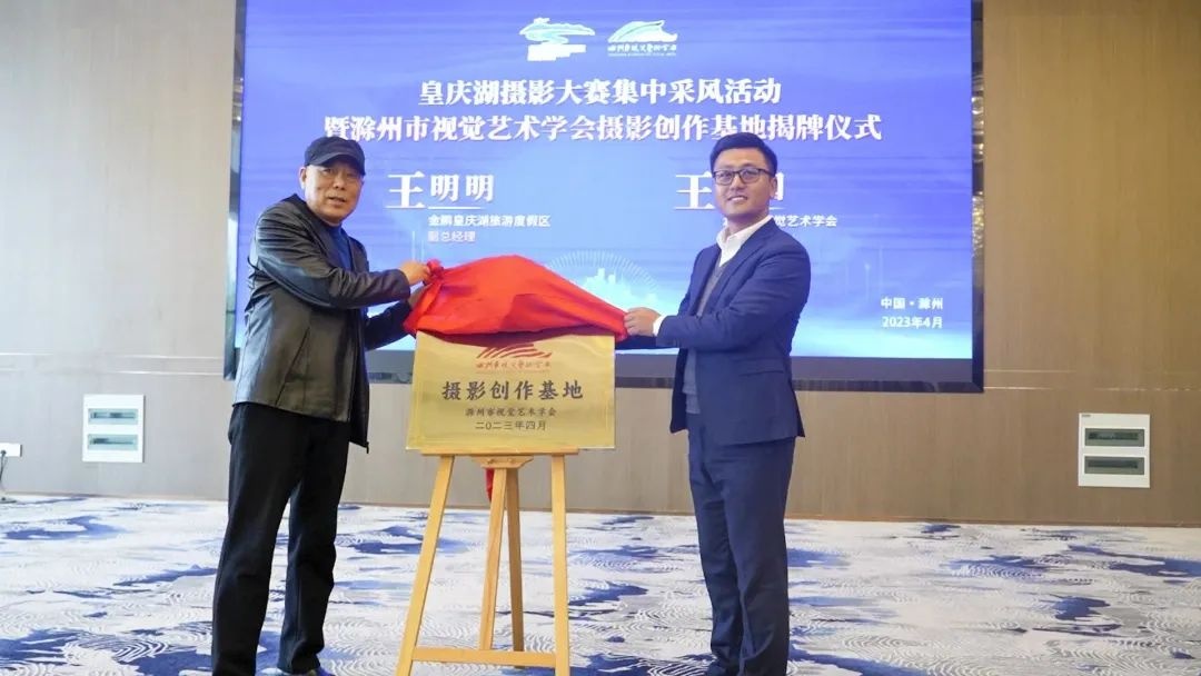 4月22日上午,皇慶湖攝影大賽集中采風活動暨滁州市視覺藝術學會攝影創(chuàng)作基地正式揭牌。滁州市視覺藝術學會會長王家國、金鵬皇慶湖旅游度假區(qū)副總經(jīng)理王明明等出席活動并為基地揭牌。
