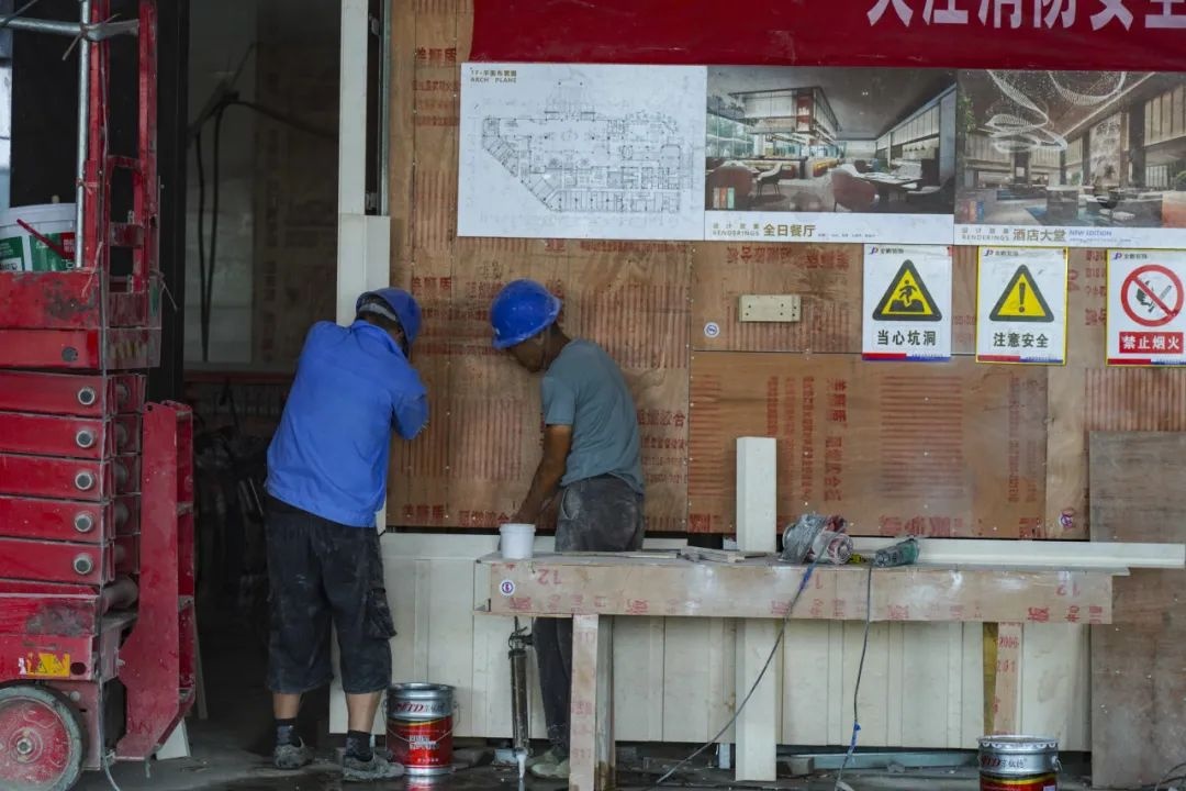 酒店內(nèi)部裝修“一天一個(gè)樣”,隨著高端大理石、瓷磚、木飾面,新型環(huán)保墻板,藝術(shù)玻璃等材料進(jìn)場(chǎng)鋪裝,酒店逐漸展露出靚麗奢華的芳容。