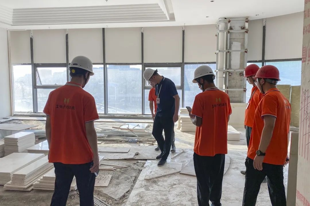 裝飾團(tuán)隊(duì)緊盯時(shí)間節(jié)點(diǎn),分標(biāo)段施工,每三層一個(gè)標(biāo)段,每?jī)商煲平灰淮?,并結(jié)合各樓層進(jìn)度,統(tǒng)籌消防、空調(diào)、水電等穿插作業(yè)。裝飾裝修過(guò)程中涉及到的硬裝、軟裝材料多不勝數(shù),各個(gè)樓層間,人員、物料上下運(yùn)輸,極盡繁忙。在大力趕超進(jìn)度的同時(shí),更在質(zhì)量上嚴(yán)格把關(guān),甚至提出更高的標(biāo)準(zhǔn)。團(tuán)隊(duì)按照設(shè)計(jì)圖紙、施工方案,結(jié)合現(xiàn)場(chǎng)實(shí)際情況,做好技術(shù)交底與驗(yàn)收工作。