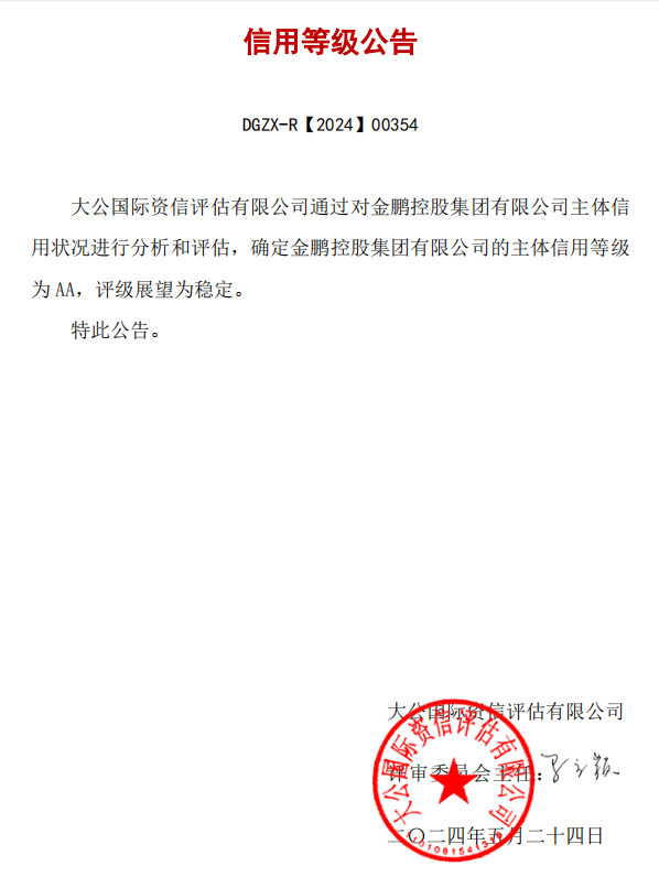 近日,大公國際資信評估有限公司通過對金鵬控股集團(tuán)有限公司主體信用狀況進(jìn)行分析和評估,確定金鵬控股集團(tuán)有限公司的主體信用等級為AA,評級展望為穩(wěn)定。