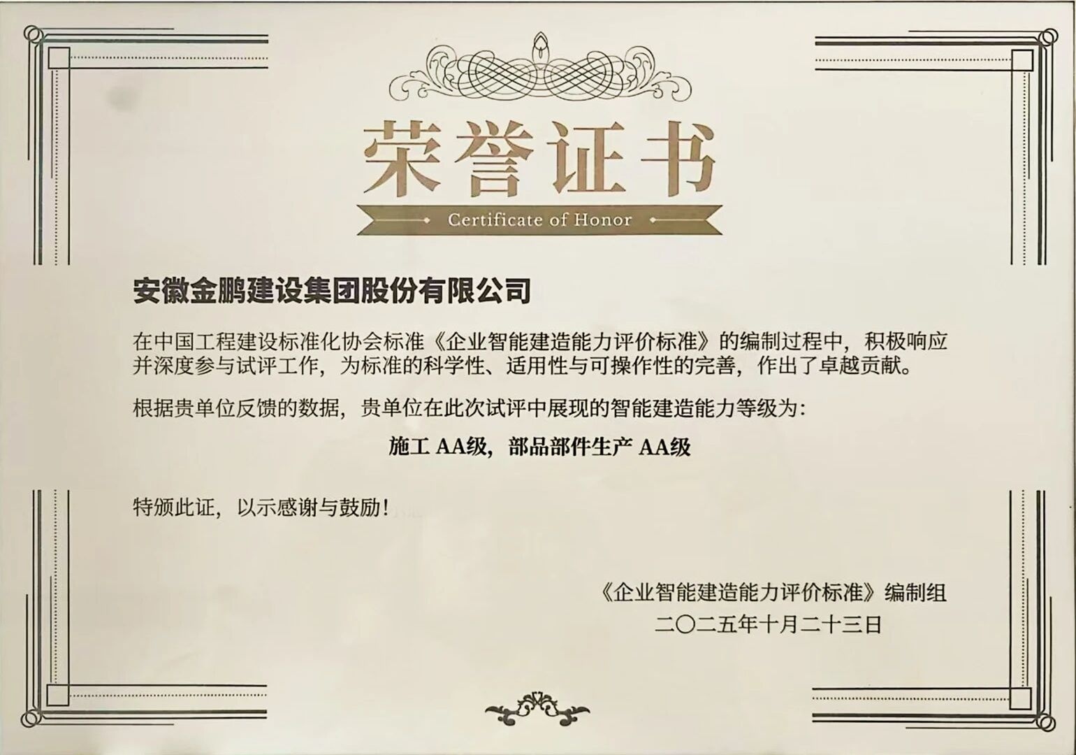 活動中還舉行了標準試評單位頒證儀式,作為17家標準試評單位之一,金鵬在中國工程建設標準化協(xié)會《企業(yè)智能建造能力評價標準》編制過程中,積極響應并深度參與試評工作,獲評企業(yè)智能建造能力施工2A級、部品部件生產(chǎn)2A級評價,為行業(yè)發(fā)展提供了寶貴的實踐數(shù)據(jù)。
